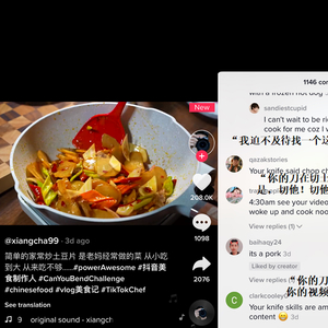 熟练地切出薄厚均匀的土豆片,五花肉打底炒出香气,配以青红椒洋葱,添色添味。随着一套行云流水的动作,一盘色香味俱全的家常土豆片就浓缩在了短短十几秒的TikTok视频中。这条视频发布仅三天,就收获了20.8万赞,在评论区,用户们留言纷纷表达了对于中国美食的喜爱和高超厨艺的赞叹。