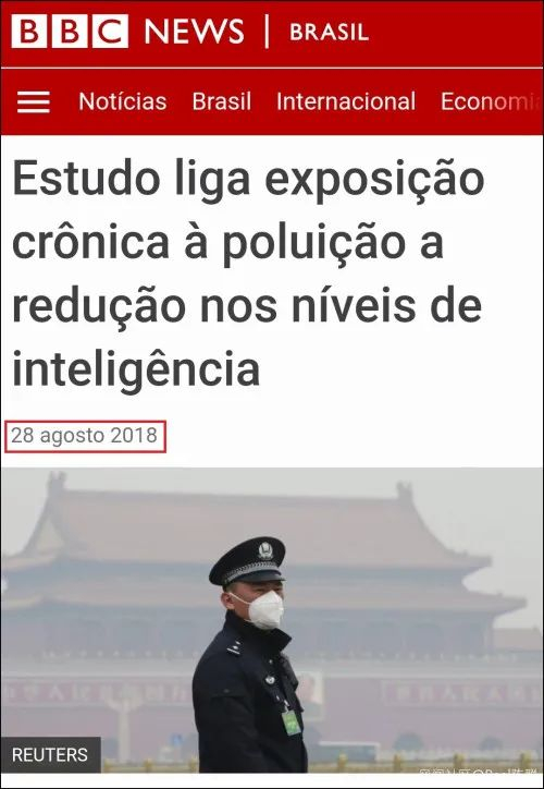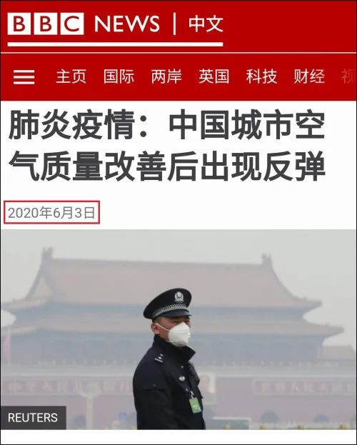 报道中,BBC配发一张中国警察戴着口罩,在雾霾下的天安门广场执勤的照片。