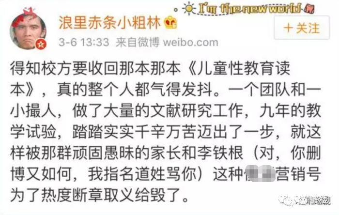 对此,该书团队成员@浪里赤条小粗林 微博直言,听到这个消息“真的整个人都气得发抖”。他痛斥一些营销号为了热度,将一本经过9年研究的教育图书“给毁了”。微博引起广泛共鸣,不到一天获得10万多次转发,1万多次评论。