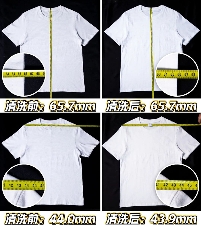 量出短袖的肩宽和衣长,在过水清洗后晾干,重新测量会看到,衣服在误差范围内基本没有变化,不会缩水。