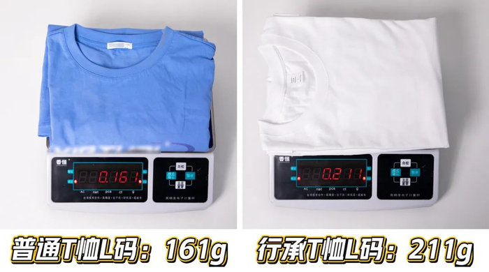 除了剪裁设计,T恤的克重也会影响版型。一平米普通的纯棉布料大概重160-180g,而行承的布料重230g,所以相同码数的行承T恤比普通品牌重一些。
