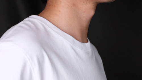 穿纯棉短袖最怕时间久了衣领皱巴,摄影师穿上行承T恤后,拽领口模拟日常穿衣时的拉扯程度,领口回弹后依旧贴合身体,没有变形。