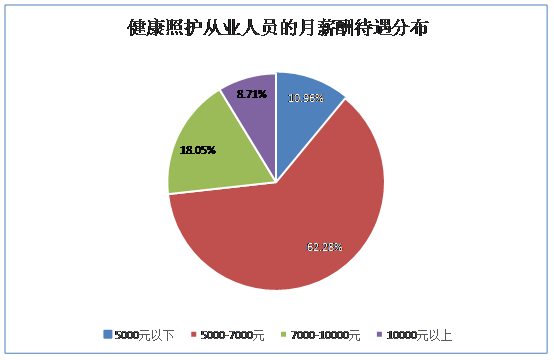 5.【月收入水平分布】目前89.04%的健康照护从业人员的实际月薪酬待遇超过5000元,特别是北上广等大城市金牌月嫂等岗位的月收入过万。具体分布为:5000元以下占比10.96%,5000-7000元占比62.28%,7000-10000元占比18.05%,10000元以上占比8.71%。
