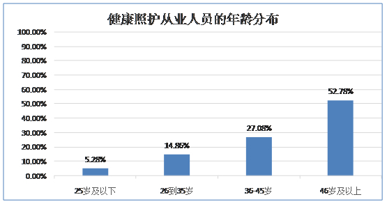 1.【年龄分布】25岁及以下占比5.28%,26-35岁占比14.86%,36-45岁占比27.08%,46岁以上占比最高,为52.78%。说明各个年龄段都有从业者,健康照护职业不仅是新人进入职场的选择,更是个人职业发展转型的重要途径。当前这个阶段4050人员占近一半比例,但随着对新职业认同感的提高,未来从业人群会逐步年轻化。
