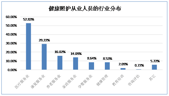 2.【行业分布】目前健康照护工作者分布在多个行业中,排前四位的分别是医疗服务业、康复服务业、养老服务业、家政服务业,另外在孕婴服务业和健康管理等行业也有较多从业者。