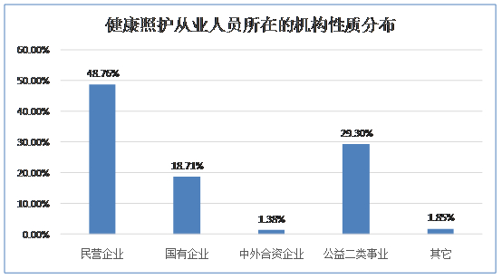 6.【机构性质分布】48.76%的健康照护从业人员在民营企业工作,29.3%在公益二类事业单位,18.71%在国有企业工作,1.38%的在中外合资企业,其他类型的机构有1.85%,因此可见各种性质的照护机构都有健康照护师的需求。