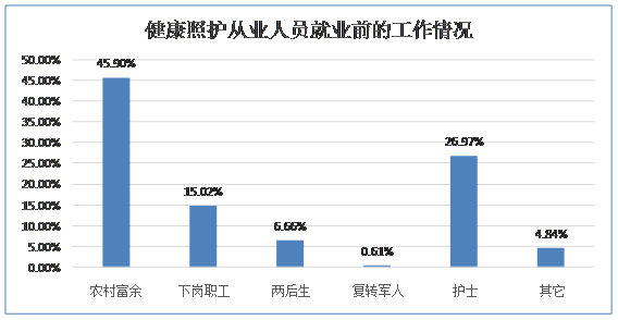 7.【解决就业情况】从事健康照护工作前的就业情况分别是,45.9%是农村富余劳动力,26.97%是护士转岗或兼任,15.02%的是城镇下岗职工(无业或灵活就业),6.66%的是初中和高中毕业之后未升学的人群(两后生),0.61%的是复转军人,其他占4.84%,主要包括康复护理师、大学毕业生等。健康照护师的就业范围广,广大农村富余劳动力、城镇下岗职工、初高中毕业后没升学的人群经过培训,都可以上岗就业。护士因具备医疗照护知识技能,很容易转岗成为健康照护师,这一新职业能解决大量就业问题。