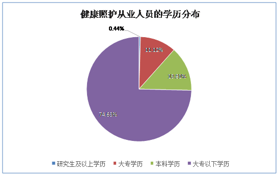 4.【学历分布】关于健康照护工作者的学历,74.63%为大专(不含)以下,11.12%为大专学历,13.81%为本科学历,0.44%为硕士研究生。目前,健康照护从业人员就业门槛较低,随着未来对健康照护师职业认可度的提高,会有越来越多高学历的年轻人加入健康照护师队伍,从而提高健康照护从业人员的整体水平。