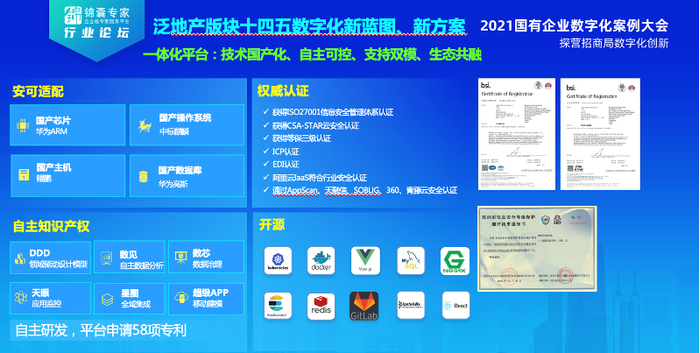 而面对越来多自主可控的诉求,明源云天际平台在安可的主机和操作系统层面,通过了华为鲲鹏CPU和主机,中标麒麟操作系统等;在系统安全性层面,研发过程引入了微软件研发安全周期管理,并通过了大量的安全性认证。天际平台的核心组件都是自主研发,共申请58项专利,在研过程中我们也引入了一些业界认可的开源组件和软件,全面保证系统的开放性以及版权的自主可控。