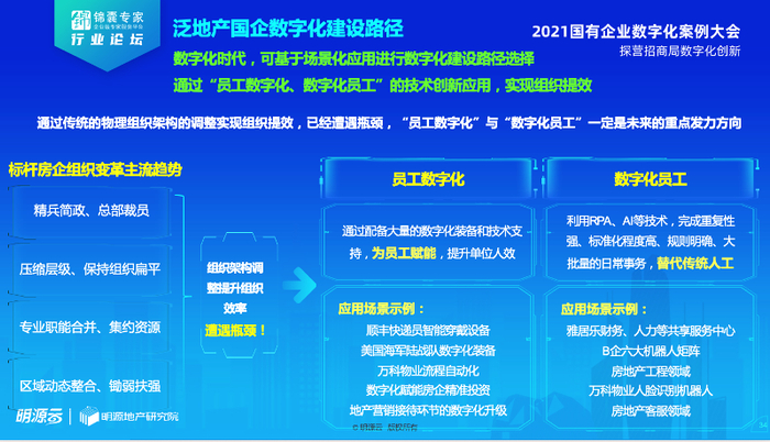 传统的物理组织架构的调整实现组织提效,已经遭遇瓶颈,“员工数字化”与“数字化员工”已成为部分国企的重点发力方向。在泛地产相关的智慧营销、智慧工地、智慧资管领域,通过新技术、新装备赋能或重构众多内外协同的业务场景数字化应用,则为“员工数字化”。而贯穿企业经营链条,从营销、成本、招采、运营、风控等业务领域,信息技术部都可以通过RPA、AI等技术,完成重复性强、标准化程度高、规则明确、大批量的日常事务,替代传统人工,则为“数字化员工”,以此实现组织整体提效。