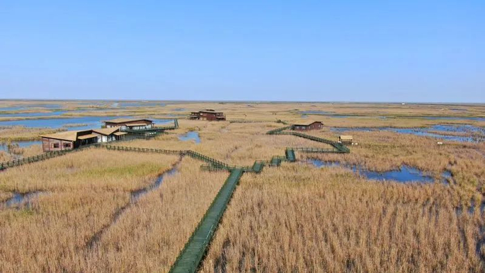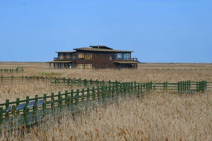 崇明东滩湿地互花迷草生态控制与鸟类栖息地优化示范区内的观鸟研究用草屋以及鸟类科普馆