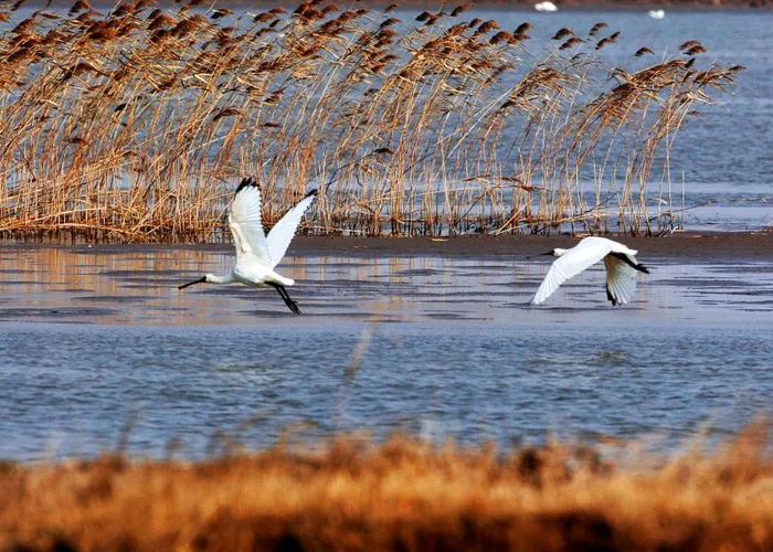 四月份的东滩湿地,尚未完全褪去黄色外表的芦苇随风摇曳,成群结队的鸟类或在水上悠闲觅食,或展翅齐飞于空中。随着近些年东滩湿地生态的进一步治理,包括小天鹅黑脸琵鹭鸻鹬雁鸭……越来越多的鸟儿开始回归,它们与大自然实时地勾勒出一幅和谐的画卷。