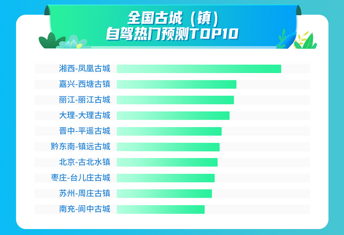 在全国古城(镇)自驾热门预测TOP10榜单中,丽江古城、大理古城排名第三、第四。