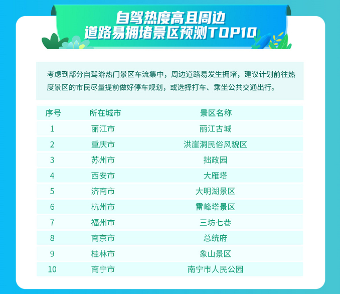 而在自驾热度高且周边道路易拥堵景区预测TOP10榜单中,丽江古城排名第一。