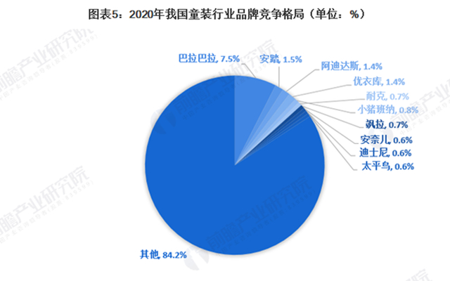 到了2020年,我国童装行业排名前三的企业市场占有率为10.4%,其中巴拉巴拉品牌市占率7.5%,是行业龙头;安踏和阿迪达斯品牌分别位列第二和第三,其品牌市占率分别达到1.5%和1.4%。