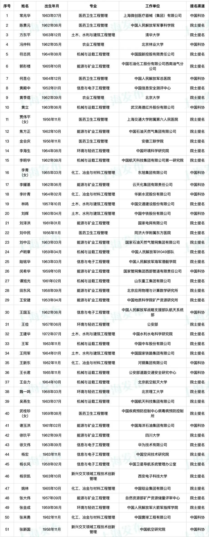 中国工程院2021年院士增选有效候选人名单