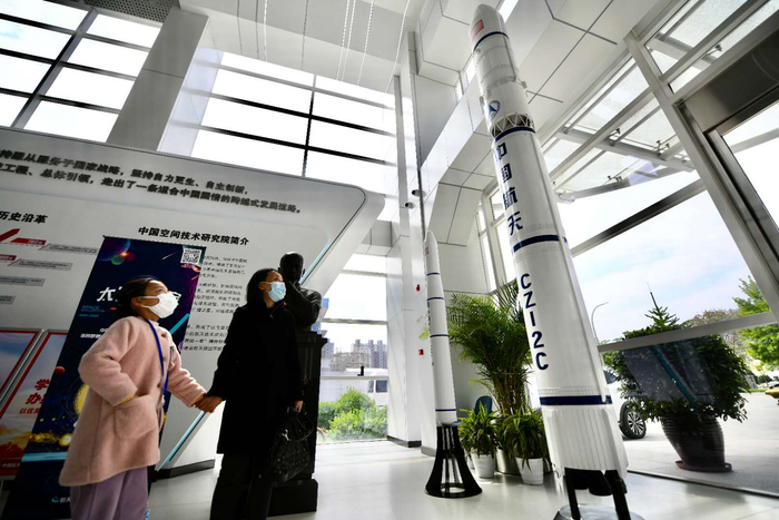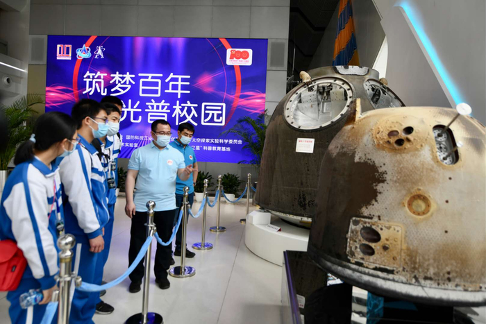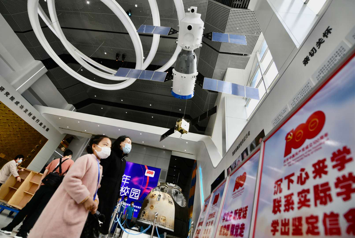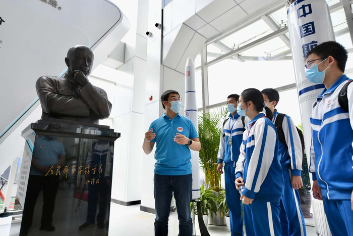 4月24日是中国航天日,上午,北京师范大学第二附属中学、中国人民大学附属中学航天城学校、首都师范大学附属中学等学校的70余名师生走进中国航天科技集团五院钱学森空间技术实验室。实验室的科研人员变身志愿者,以通俗的语言为学生们讲解空间站、空间信息网络、太空发电站等前沿领域的知识,带领大家参观五院的科研成果展览。