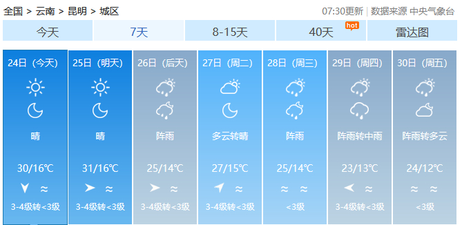 具体到昆明主城区来看,周末两天,在晴天主导下,都将开启冲击30℃的“飙高温”模式。周六,气温16~30℃;周日,气温16~31℃。