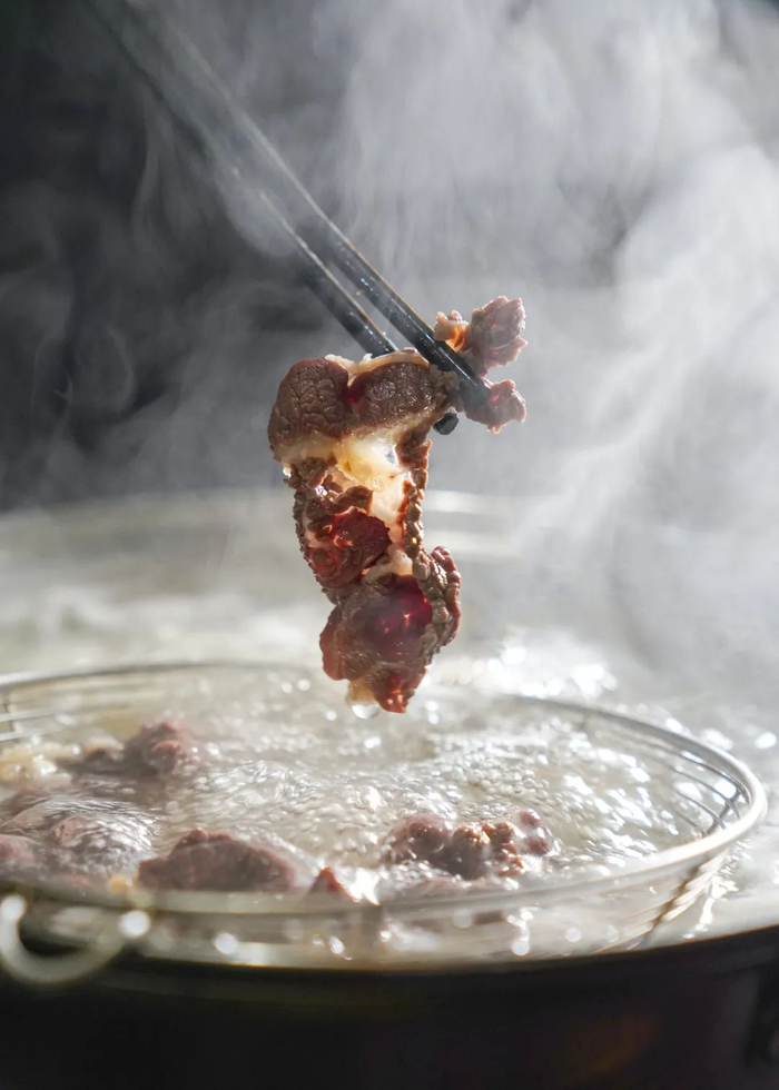 受火候影响最大的五花趾,只需清汤中三起三落就已经达到最佳食用时间。顶级的脖仁则更是娇贵,放到锅底中涮上8秒左右,就可食用。