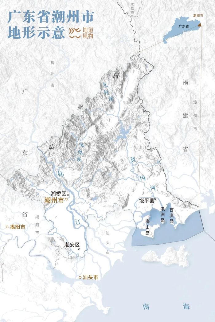 黄冈河与韩江分列东西,是潮州境内较大的两条河流,奔流入海。纵观潮州地形,山区占据全域面积的65%之多,可用耕地也相对较少,靠海的生存环境,让潮州人具有冒险和开拓精神,造就了潮州人重商的特质。