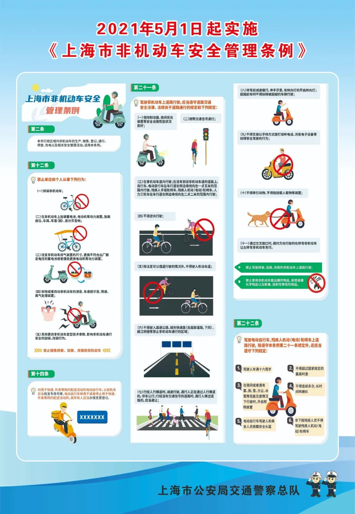 将于2021年5月1日起正式施行的《上海市非机动车安全管理条例》,其中对常见违规现象如违规载人、超速行驶、不佩戴安全头盔、夜间行驶中不开车灯等违章问题突出进行明令禁止。检察官提醒,遵守交通法规,提升安全意识,既是对自己、对家人的生命负责,也是为他人的安全保障。