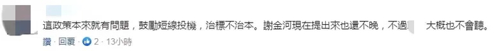 就这篇报道,不少台湾网友抨击民进党当局的金融政策,称,“这政策本来就有问题,鼓励短线投机,治标不治本。谢金河现在提出来也还不晚,不过民进党当局大概也不会听。”↓