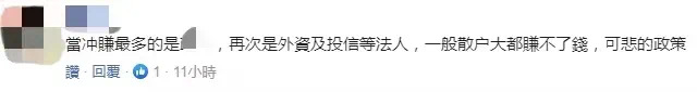 还有网友表示,“当冲赚最多的就是民进党当局,再次是外资...一般散户大都赚不了钱,可悲的政策。”↓