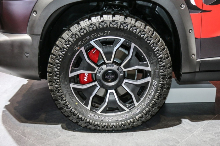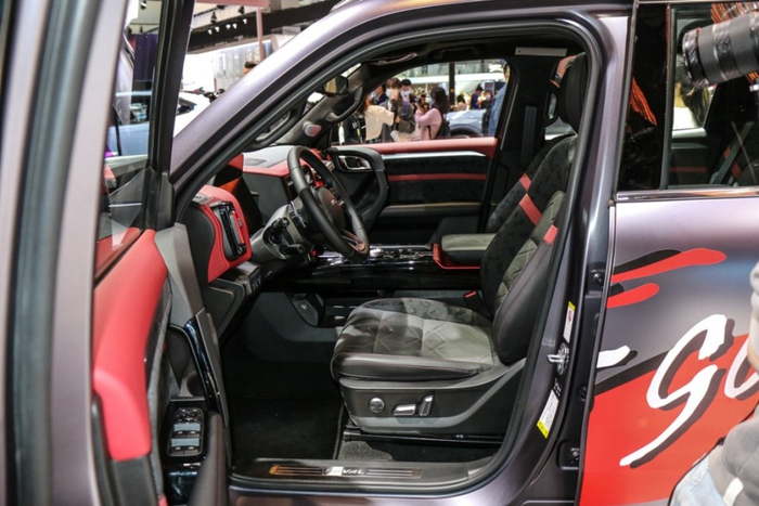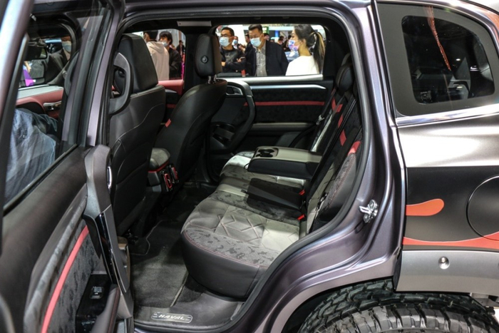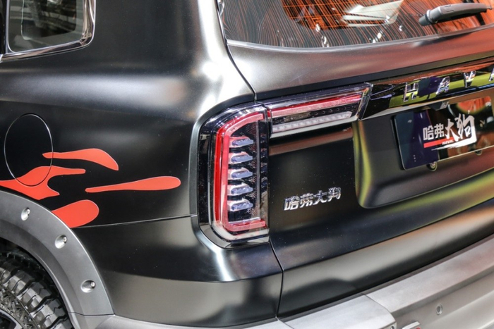 车身侧面带有大面积岩浆状拉花,向后喷溅的状态,进一步提升了整车狂野的氛围感。同时,该车配备有双色六幅轮圈,并装配了AT越野轮胎。搭配向外扩宽的轮眉、裸露式铆钉以及粗犷的前后保险杠,让大狗看上去更加硬派。