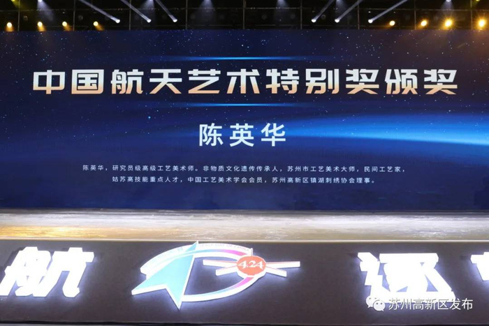 4月24日,苏州高新区镇湖绣娘陈英华带着她的“宇宙星空系列”刺绣作品登上2021年“中国航天日”启动仪式暨中国航天大会开幕式的领奖台,捧回国家航天局首届“太空探索与艺术创想大赛”特别奖。