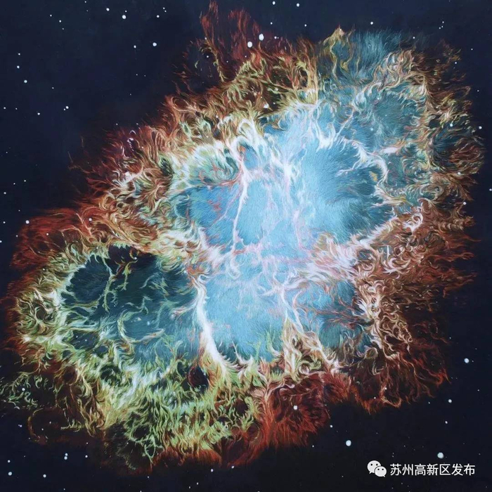 现场,陈英华共带来了五幅刺绣作品,其中就有最为著名的《蟹状星云》、《马头星云》、《鹰状星云》、《猎户座大星云》以及新作《石刻天文图》。