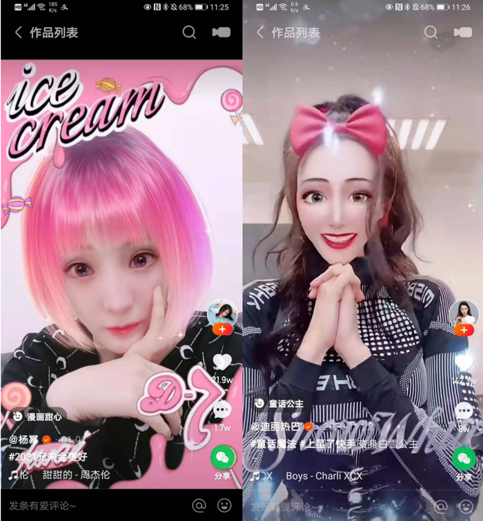 据悉,魔表作品已经成为快手社区重要内容组成部分,每天都会产生600万新作品,日均播放次数超过10亿,大量深受人们喜爱的创意视频,都是借助魔表创作而成的。目前,快手特效魔表已经上线超过2万款,每天还在持续更新中。除了广大普通用户,魔表也颇受明星用户喜爱,比如杨幂拍摄过的“漫画甜心”魔表让她变身一头红发,迪丽热巴拍摄的“童话公主”魔表作品更是点赞量达到了140万。