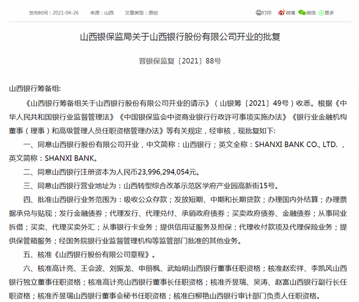 4月26日,山西银保监局发布的《关于山西银行股份有限公司开业的批复》(下称《批复》)显示,核准高计亮、王会波、刘振龙、申丽枫、武灿明山西银行董事任职资格;核准赵宏祥、李凯风山西银行独立董事任职资格;