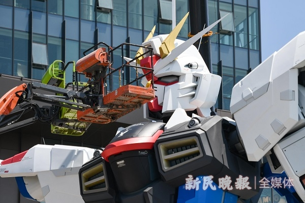 图说:实物大自由高达立像展开头部安装作业 新民晚报记者 陈梦泽 摄(下同)