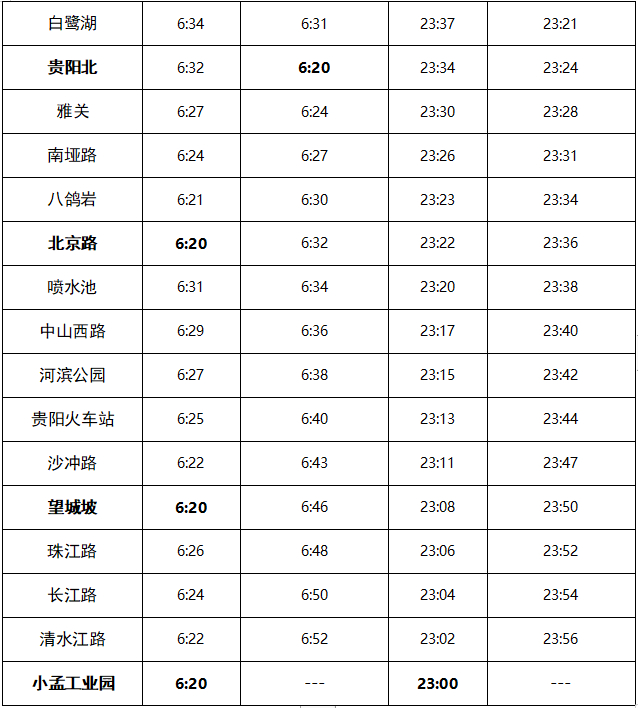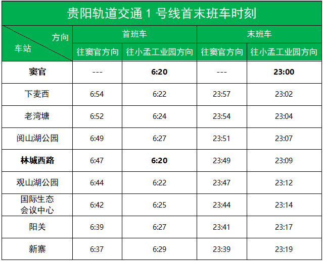 此次列车运行图调整后,1号线常态运营时间依然为6:20至23:00。其中往窦官方向,小孟工业园站、望城坡站及北京路站首班车发车时间均为6:20,往小孟工业园方向,窦官站、林城西路站及贵阳北站首班车发车时间均为6:20,末班车发车时间均为23:00。