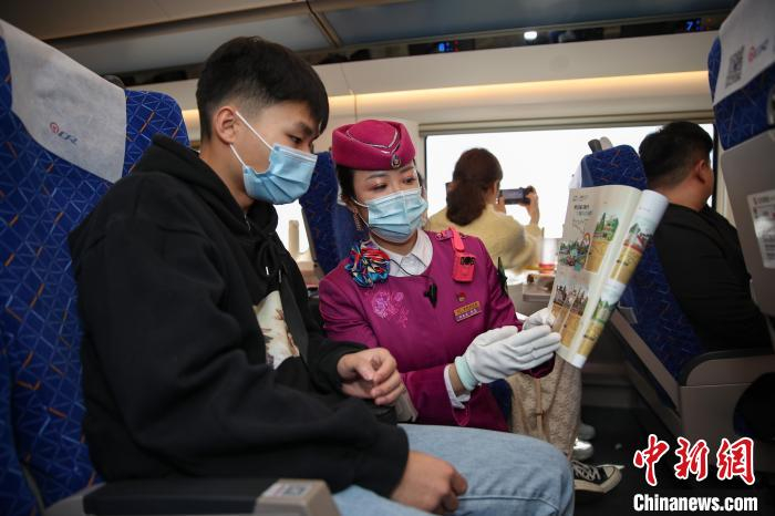 4月26日,记者登乘贵阳北至贵阳北的C6011/C6012次“多彩环线”复兴号动车组列车,感受“多彩之旅”。“多彩环线”是中国铁路成都局集团公司贵阳客运段为“复兴号”西南高铁环线动车组定制的服务品牌。该环线在四川、重庆、贵州三个省级行政区之间跨省成环,是中国首条定制高铁环线动车。环线全线运营总长超过1290公里,由重庆西至重庆西、成都东至成都东、贵阳北至贵阳北、重庆西至重庆北之间各自开行,每趟列车全程运行时间约8小时。