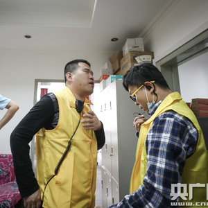杨青风(中)戴上对讲机准备培训(央广网记者 韩靖 摄)