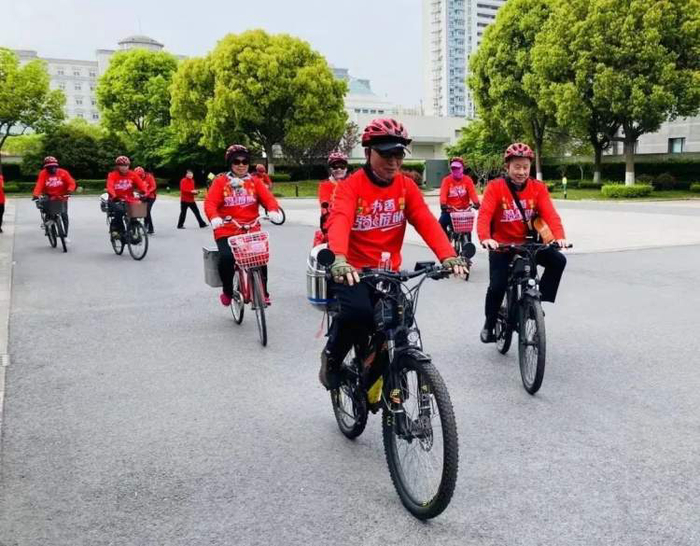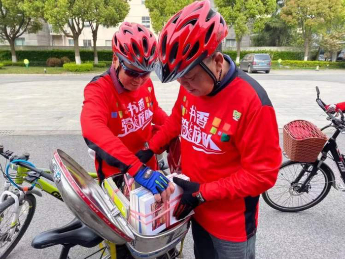 头戴红色头盔,身着红色队服,脚踩自行车,仔细一看,后座上还安装了“文化外卖”储物箱,这支精气神十足的队伍就是安亭书香骑游队。队长张林元是一名党员,他介绍,队伍成立之初纯粹为了骑游健身,大家隔三差五自行集合,车轮印迹遍及周边城市。有一次,大家在无意中了解到安亭镇农家书屋和百姓书社有配送书籍的需求,于是毛遂自荐:“这个比单纯骑游更有意义,让我们来吧!”