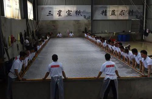 近日,在宣纸产地安徽省宣城市泾县,“四丈宣纸”的抄制在一家纸业有限公司启动。50余名捞纸师傅操作巨型纸帘,齐心协力,在纸槽旁进行捞纸作业。来回起落两次,动作整齐划一。随后工人们将纸帘吊起放至一边揭下,一张巨大的宣纸便捞制成功。经过晒、剪等工序后, 制成长13.2米、宽3.6米的巨型宣纸就是“四丈宣纸”。