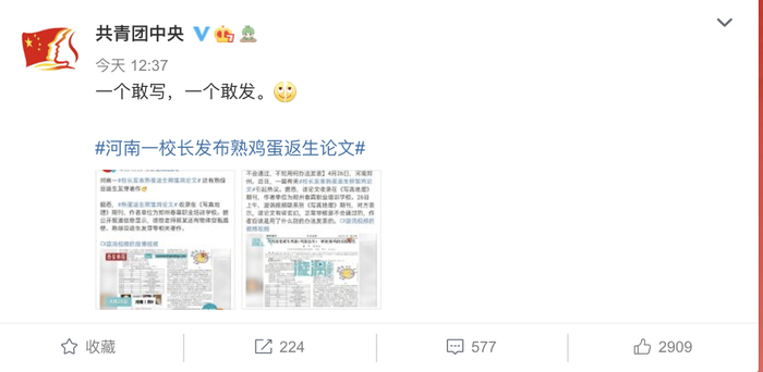 4月26日,河南郑州春霖职业培训学校校长郭萍的一篇论文在网上疯传。论文称,在实验中将煮熟的鸡蛋通过手段返生,成功孵出了小鸡,并且已经成功返生了40多枚。