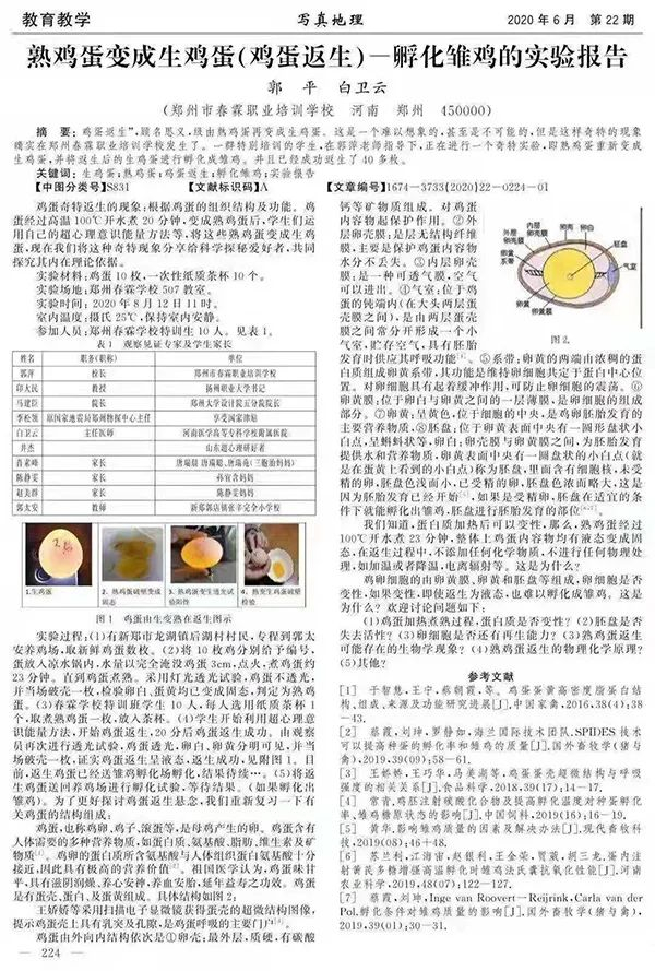 该论文全称《熟鸡蛋变成生鸡蛋(鸡蛋返生)——孵化雏鸡的实验报告》,由《写真地理》杂志刊发,作者郭平、白卫云,单位郑州春霖职业培训学校。