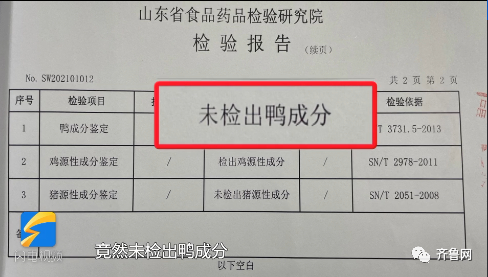 记者在小龙坎伟东店现场购买了一份鲜鸭血后,送往山东省食品药品检验研究院进行检测。拿到的权威检测报告显示:小龙坎伟东店里售卖的鲜鸭血竟然未检出鸭成分!