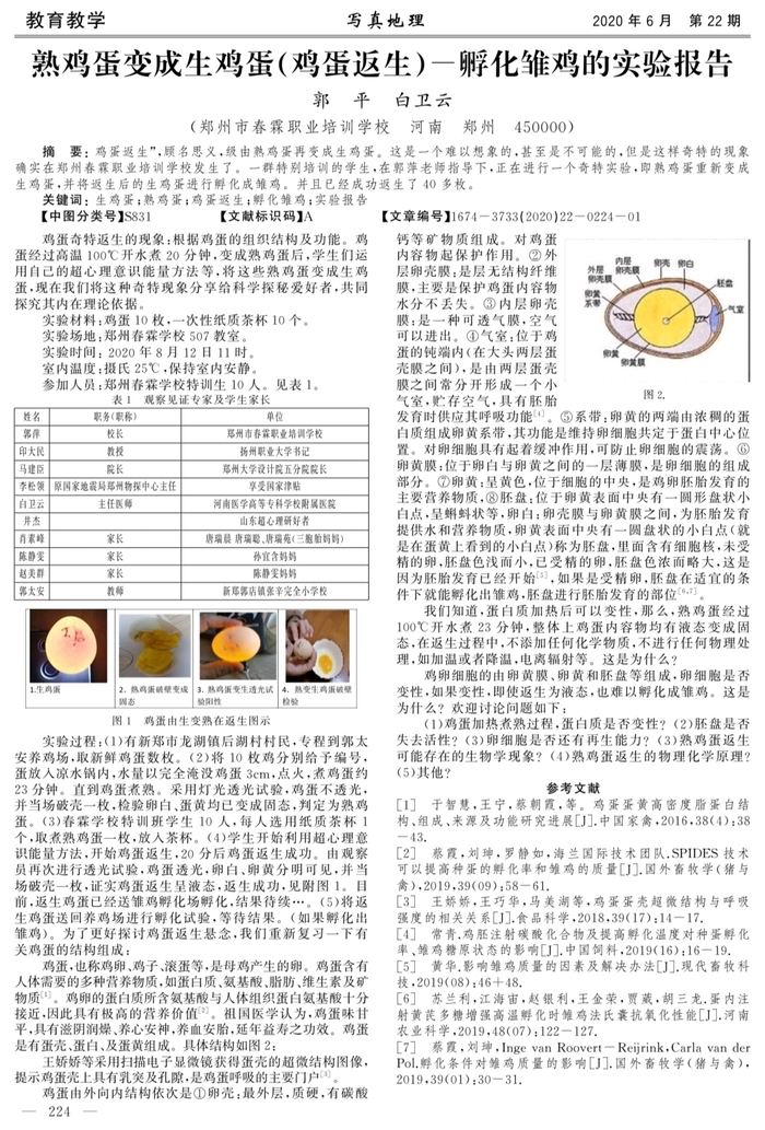 发表在《写真地理》杂志上的鸡蛋返生论文一共2篇。第一篇发表于2020年6月,作者为郭平、白卫云,论文名字为《熟鸡蛋变成生鸡蛋(鸡蛋返生)-孵化雏鸡的实验报告》。第二篇发表于2021年3月,作者为郭萍、郭太安、印大民、白卫云,论文名字为《“熟鸡蛋鸡蛋返生孵化雏鸡”实验报告(孵化阶段)》(注:原标题即如此)。
