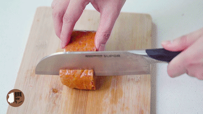 手起刀落间,明显感觉得到,它一点也不油腻,也不会粘连在刀背上,一刀下去还会带出一些分明的肉丝,切开后的午餐肉,才算是露出“真颜”。