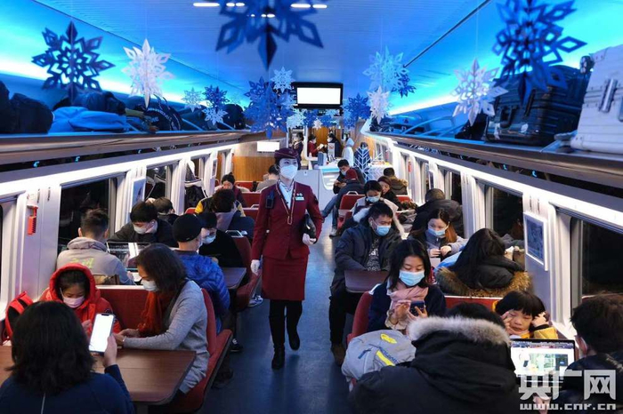 同时,记者体验到,这趟冬奥会专列在设计上也加入了冬奥会元素。这趟 5号车厢为多功能车厢,由餐吧区域和多功能区域组成。餐吧吧台采用开放式设计,车厢视觉通透,旅客可以更加直观的选购商品,同时餐吧还增设制冰机、咖啡机、面包机,准备了丰富的食品和饮品供旅客进行选择。餐吧顶端采用的是放射性灯光,动态呈现奥运五环图案,与智能动车组的奥运主题相映成辉、相得益彰。餐吧配有大尺寸显示屏,应用了5G移动通信网络,可实现5G高清赛事转播。餐吧和多功能区域之间是绘有雪花图案的玻璃屏风,多功能区域车顶悬挂着雪花形状的挂饰,车厢墙板张贴着冬奥相框,对冬奥各类赛事、奥运场馆进行介绍,提高民众对冬奥会的认知和关注。在蓝色灯光映衬下,冰雪元素随处可见,使车厢冬奥主题氛围更加浓郁。多功能区域设有12套工作台面,共48个座位,工作台面均采用推拉设计,拉伸后最大宽度为80厘米,在每个工作台面下方都配有多电源插口,为媒体工作人员提供便利的工作条件。
