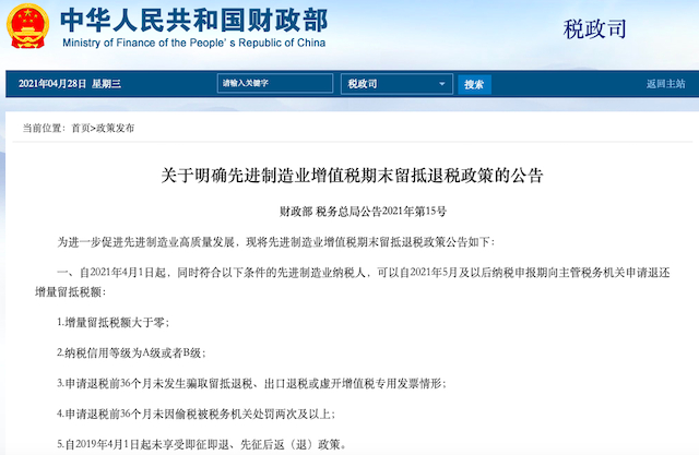 《公告》称,自2021年4月1日起,同时符合以下条件的先进制造业纳税人,可以自2021年5月及以后纳税申报期向主管税务机关申请退还增量留抵税额。