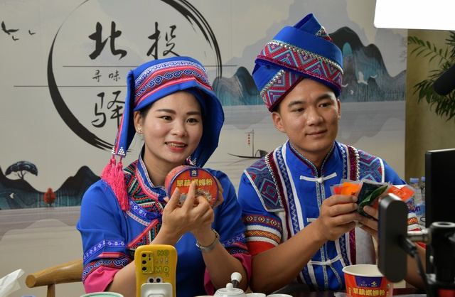 4月27日,在广西南宁南高速公路收费站“那文化”服务区,工作人员正在直播销售螺蛳粉。摄影/立早