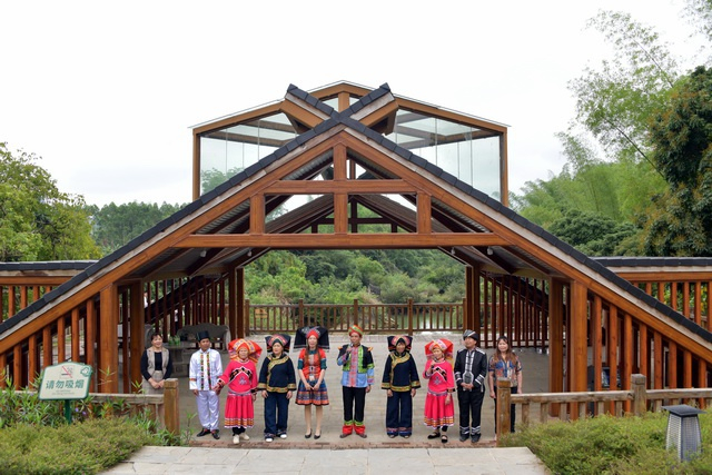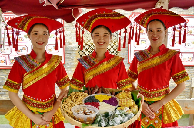 4月27日,崇左市卜花村,穿着民族服装的村民请游客品尝特色食品。摄影/立早