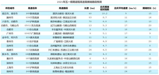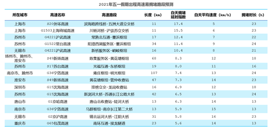 数据显示, 5月1日,全国高速出程较易拥堵的路段主要有:S20外环高速上海段,白天拥堵延时指数达17.4,平均速度约为5千米/小时,其次是G1503上海绕城高速上海段以及G4221沪武高速苏州段。