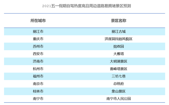 考虑到部分自驾游热门景区车流集中,周边道路易发生拥堵,建议计划前往丽江古城、重庆洪崖洞民俗风貌区、苏州拙政园、西安大雁塔、济南大明湖等景区的市民尽量提前做好停车规划,或选择打车和公共交通出行。