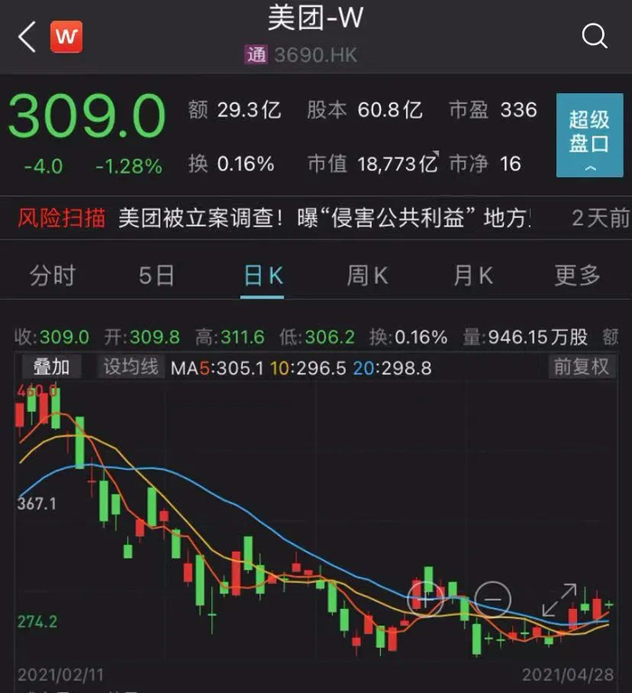 但或许是利空已出的原因,股价在4月27日有所回升,截至发稿,美团股价报309港元/股。